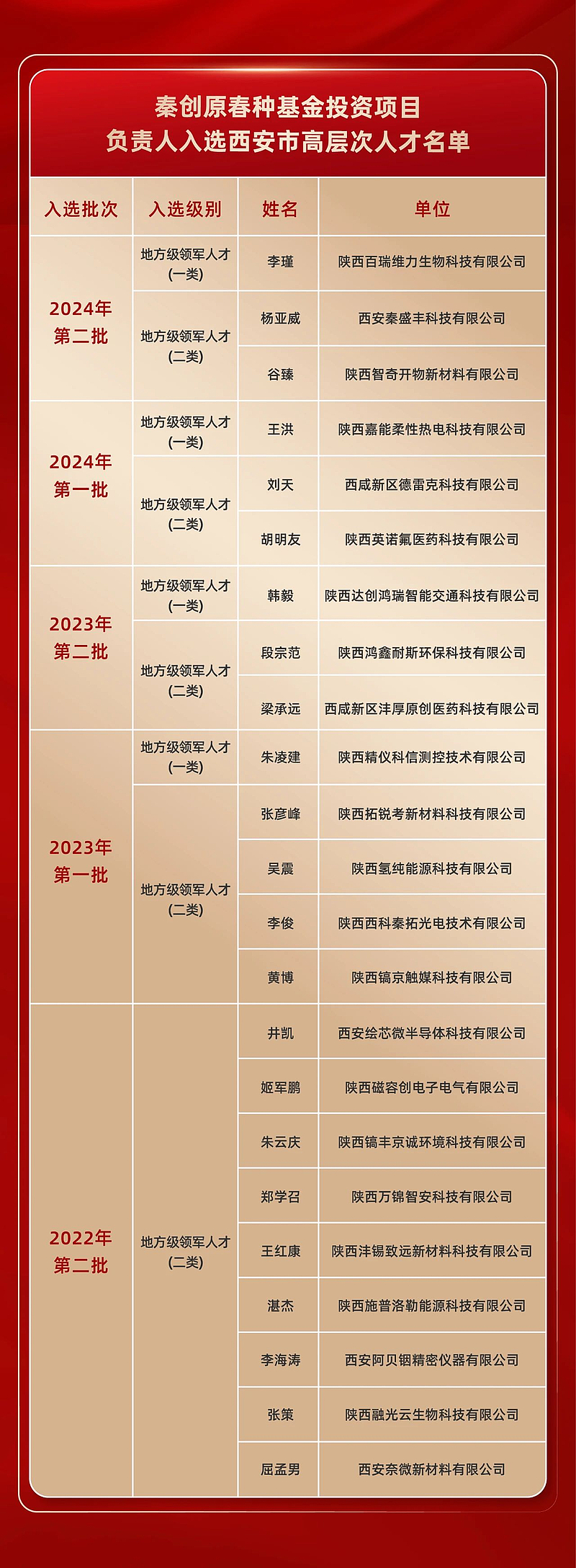 近日,中共西安市委人才工作領導小組發(fā)布了《2024年西安市第二批高層次人才》名單,秦創(chuàng)原春種基金投資支持的3名項目負責人入選!目前,共計23名秦創(chuàng)原春種基金投資項目負責人入選西安市高層次人才名單。
